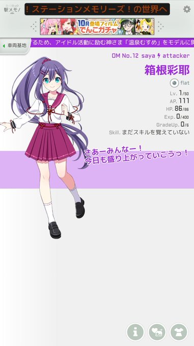 駅メモ 箱根彩耶-箱根彩耶(cv長江里加) 秋保那菜子(cv高橋花林) 有馬輪花(cv本宮佳奈) 道後泉海(cv篠田みなみ) 登別綾瀬(cv日岡なつみ) 下呂美月(cv遠藤ゆりか) 有馬楓花(cv桑原由気) 奏・バーデン・由布院(cv:和多田美咲) しゃんぷーはっと こんにちは、有馬楓花だよ♪ 今、ふうかはお友達の箱根彩耶ちゃんのお家に遊びに来てるんだ! 一緒にお風呂に入ってお話してたんだけど、 ふうかまだまだ全然話足りないな♪ 今回もいーっぱい彩耶ちゃんとお話して、 もっともっと仲良しになっちゃおうかな、かな♪